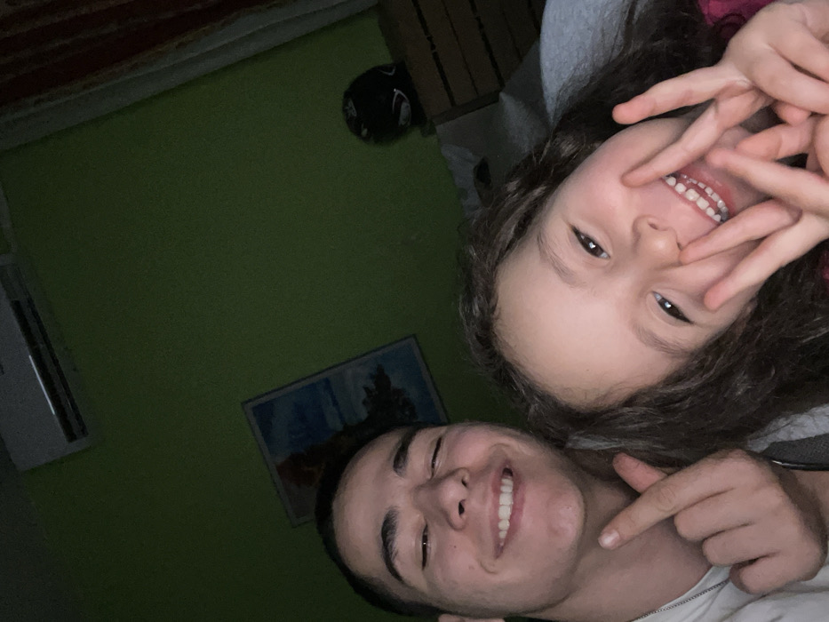 An indoor photograph depicts two individuals in a dimly lit room with lime green walls. On the left, a young male, appearing to be in his late teens or early twenties, with short dark hair, smiles directly at the camera. He wears a light-colored shirt and a thin chain. His left hand is raised to his chin, with the thumb and index finger forming a heart gesture. To his right, a young female child, appearing to be between 4 and 8 years old, with long dark hair, also smiles at the camera. She has both hands raised in front of her face, each displaying a two-finger "V" or peace sign gesture. In the background, an air conditioning unit is mounted high on the lime green wall. Below it and to the left of the male's head, a framed picture featuring blue and white tones is visible. To the far right, a dark motorcycle helmet rests on a wooden bedside table or dresser, which features horizontal slat-like details. A reddish curtain is partially visible on the far right edge of the frame. The specific location in the city of Silistra, Bulgaria, is not discernible from the image.