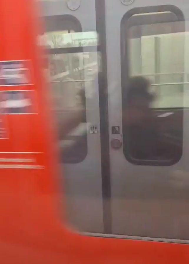 interior of a train car through the window of a train traveling along train tracks. The exterior of the train car is a red color. The interior of the train car has gray-colored doors with rectangular windows. People sit in the other train car, visible through the door windows. The train is traveling next to a train platform, with a gray structure, benches, and a low white fence. Trees are visible in the background.