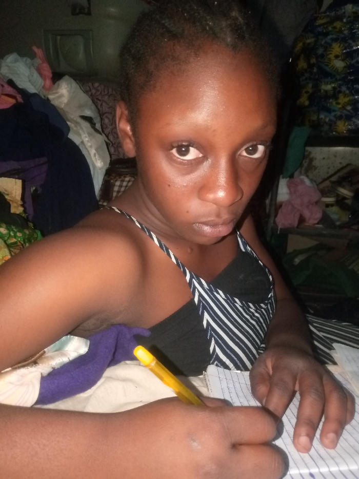 A dark-skinned woman is captured from the chest up, engrossed in writing on a lined notebook with a yellow pen. She has short, dark hair pulled back, and wears a black and white striped tank top. The background is cluttered with clothes and personal items, creating a sense of domestic intimacy. Her gaze is slightly upward, suggesting a contemplative mood.