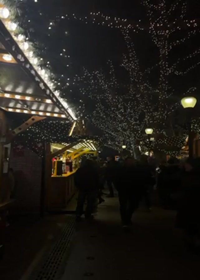 The video depicts a nighttime scene at what appears to be an outdoor market or festival. Several people are walking down a pathway. On the left, there are wooden vendor stalls decorated with lights. Trees on the right are also illuminated with strings of lights. Street lamps are present, providing additional light to the area. The atmosphere appears festive and crowded.