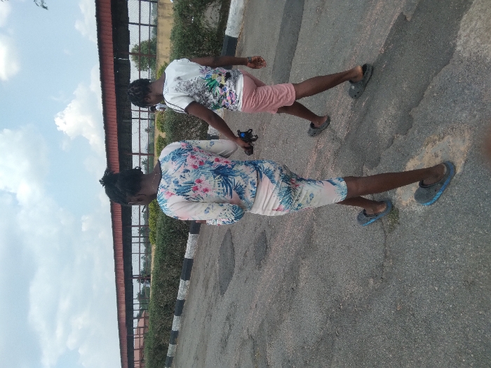 Two individuals are depicted walking away from the camera on a paved surface in Ipetumodu, Nigeria, under a partly cloudy sky. The person in the foreground wears a light-colored, form-fitting dress or top and skirt with a blue and pink floral pattern and dark blue slip-on shoes; they are holding a dark object in their right hand. The second individual, positioned slightly behind and to the right, wears a white short-sleeved top with a floral pattern, light pink shorts, and dark grey slip-on shoes, and appears to be holding the left arm of the first individual. A black and white striped curb borders the paved area to the right, followed by a hedge of green bushes. In the background, a long, low-lying structure with a reddish-brown roof is visible, with sparse trees beyond it.