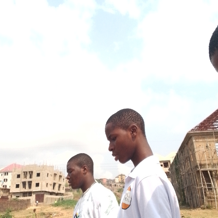 This image depicts an outdoor scene in Unknown, Unknown, under a bright, partly cloudy sky, with three individuals and multiple structures under construction. In the foreground, right of center, a young male with short dark hair is partially visible, wearing a white polo shirt with an orange and white circular logo on the right chest, facing left with slightly parted lips. To his immediate left, another young male, with short dark wavy hair, wears a white t-shirt with a faint design and a silver-colored chain, looking down and to the left with slightly parted lips. In the background, to the left, a multi-story concrete building is under construction, displaying exposed window and door frames and a partially installed red or orange roof. To the right, another concrete building under construction features wooden scaffolding along its exterior and a reddish-brown tiled roof structure. A smaller, indistinct human figure is visible in the distant left background near the first construction site. The immediate ground consists of uneven, undeveloped earth with sparse vegetation.