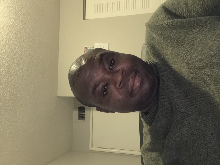 A man with a shaved head and dark skin is captured in a close-up shot, wearing a green sweater. He appears to be indoors, as a textured wall is visible to his left. A door or panel with a vent is seen behind him on the right. The image has a slightly blurred quality. The man is looking directly at the camera with a neutral expression.