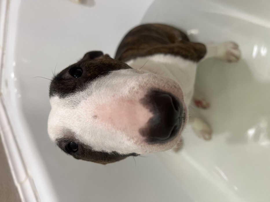 - "A brindle and white Bull Terrier dog is depicted inside a white bathtub containing a shallow layer of clear water" by FM-eMmYM2, licensed under CC BY 4.0