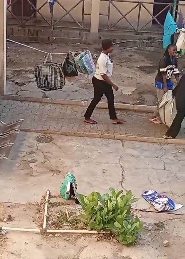 The scene shows an outdoor courtyard with a two-story building in the background. The building has doors and windows on both levels and a low wooden fence along the second story. In the foreground, there is a small garden with green plants and a system of pipes. Several people are visible: a person in a white shirt and black pants walks across the courtyard carrying a large plaid bag and smaller bags. Three other people are working on laundry, taking clothes off a makeshift clothesline made of poles and string. Various items, including clothes and a pair of sandals, are scattered on the ground. The overall impression is of a somewhat disorganized and cluttered outdoor space.