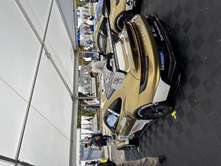 The image depicts a static scene within a temporary event tent at the Autodromo Nazionale Monza, Monza, Italy. Two gold and white Porsche 911 GT3 Cup race cars are prominently displayed on a black interlocking floor. The car in the foreground, labeled with number "10", features sponsors including "Mobil 1", "Centri Porsche di Roma", "Glasurit", and "Michelin". Its large rear wing and diffuser are visible. A second, partially visible Porsche GT3 Cup car, also gold and white, is positioned behind and to the right of the first, displaying "UnipolSai" and "Navaltecnica" sponsors. Under the tent, several individuals are present. One person in a light grey long-sleeved shirt is leaning over the hood of the second Porsche, apparently engaged in an inspection or adjustment. To the left, a man with a beard and dark backpack holds a mobile phone, observing the cars. Other onlookers are scattered throughout the tent area. The tent itself has a white fabric roof supported by metal beams. Beyond the tent's perimeter, a chain-link fence separates the display area from an outdoor crowd of numerous people walking and standing on what appears to be a paved surface. In the background, green foliage and white industrial-style buildings are visible under an overcast sky. The overall scene suggests a motorsport paddock or exhibition event.