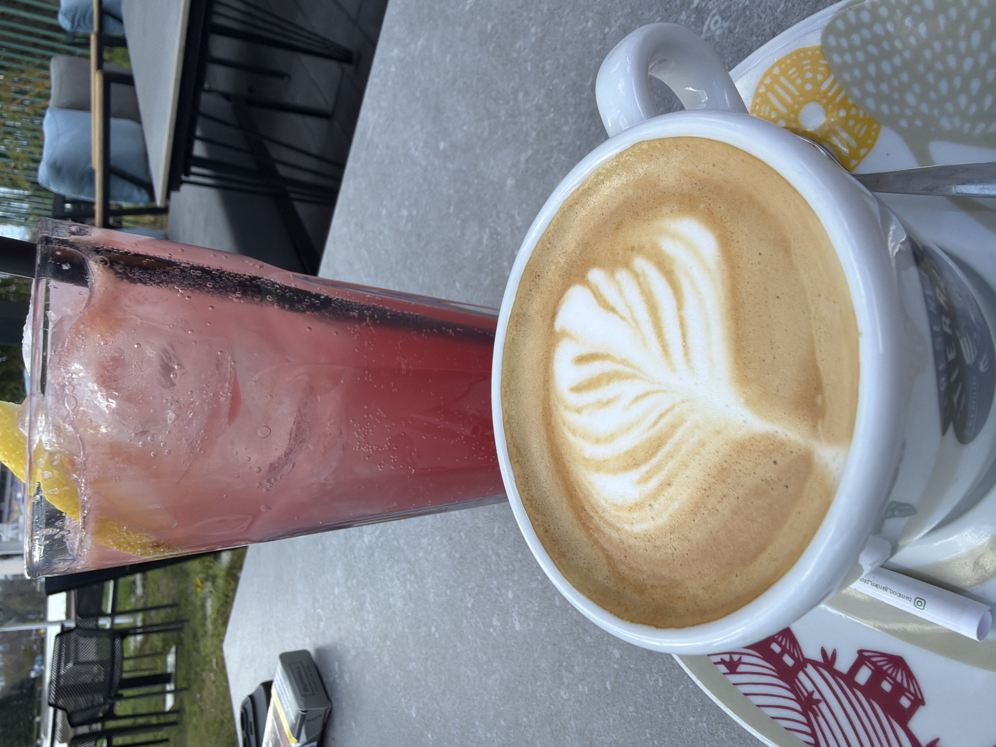 A partially visible glass of pink lemonade with ice and lemon slices sits on a grey table next to a cup of coffee with latte art