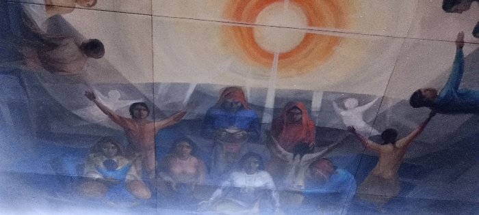The image depicts a mural-style painting with a group of people gathered under a bright, stylized sun. Some figures are seated, while others are standing with arms raised. There are a few figures floating in the upper part of the painting. The color palette is muted, using shades of blue, orange, white, and brown. The overall style has a spiritual or mystical quality.