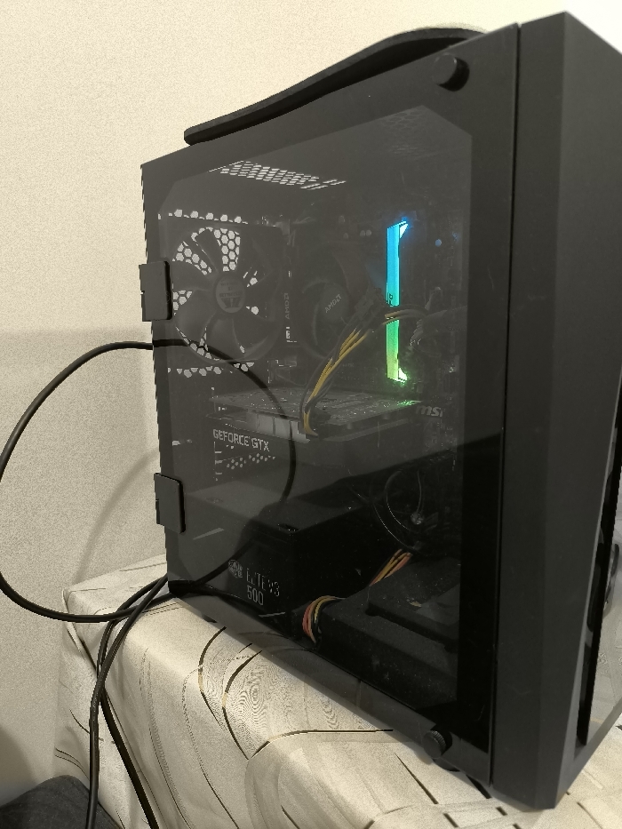 The image presents a black desktop computer tower, viewed from an oblique angle, positioned on a surface covered by a patterned fabric. The computer case features a transparent tempered glass side panel secured by visible black fasteners, revealing internal components. Inside the case, a circular black CPU cooler fan is visible, bearing an "AMD" logo. An "AMD" logo is also present on the motherboard. Below the CPU cooler, a graphics card is horizontally mounted, prominently displaying "GEFORCE GTX" branding. A single stick of RAM is visible, illuminated by an active vertical RGB light strip, transitioning from blue at the top to green at the bottom. The lower section of the case shows a partially visible power supply unit labeled "COOLER MASTER ELITE V3 500." Yellow and black braided power cables are routed within the case. A black internal fan with a honeycomb-patterned grill is visible in the upper rear section of the interior. The computer case is black with a dark, curved top edge. A thick black cable extends from the rear of the computer, looping onto the surface below. This surface is covered with a light-colored fabric or tablecloth exhibiting an abstract, wavy pattern. The background consists of a plain, light-colored wall. No individuals or external objects are visible in the immediate vicinity of the computer. The specific location within the city of Varna, Bulgaria, cannot be determined from the visual information provided in the image.