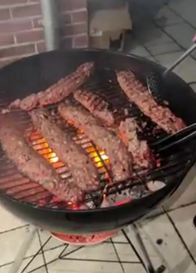A person is grilling rows of small, long sausages over a charcoal grill in what appears to be an outdoor patio