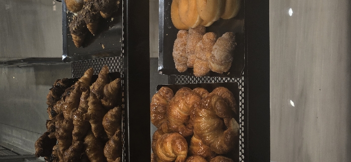 Three shelves hold an array of baked goods. The top shelf on the left presents chocolate-covered croissants. The top shelf in the center showcases round, sugared pastries and smaller, sugar-dusted croissants. The bottom shelf on the left overflows with glazed croissants. The bottom shelf in the center features a collection of golden brown croissants. All are displayed behind glass, suggesting a bakery display case.