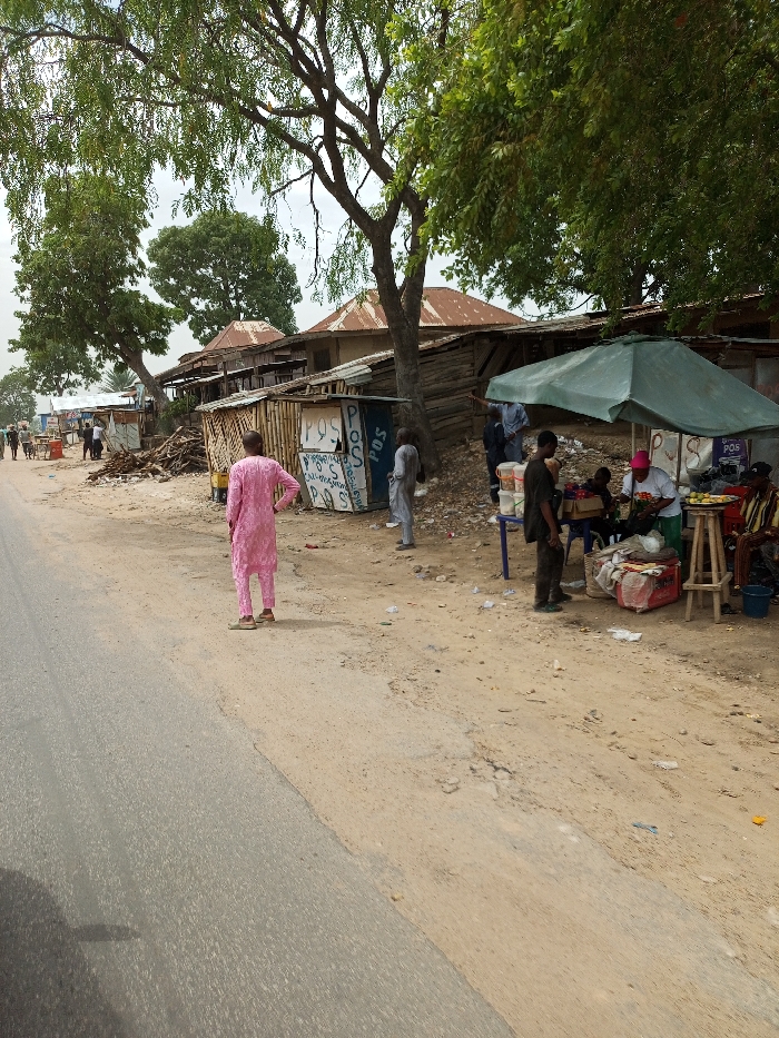 street scene in Ohunene, Nigeria. There are several small shops and stalls lined up on the side of the road. A large tree branches over the scene. There are a few people in the scene. A man in a pink robe is standing to the left of the center. Several men and women stand behind a stall, some with items in their hands. A few people are walking on the road toward the left side of the image. A green tarp is draped over a wooden frame as a canopy over a stall on the right side of the scene. Some of the shops appear to be closed or abandoned, while others are open and selling goods. The road is made of dirt and gravel. There is a large amount of debris on the ground.