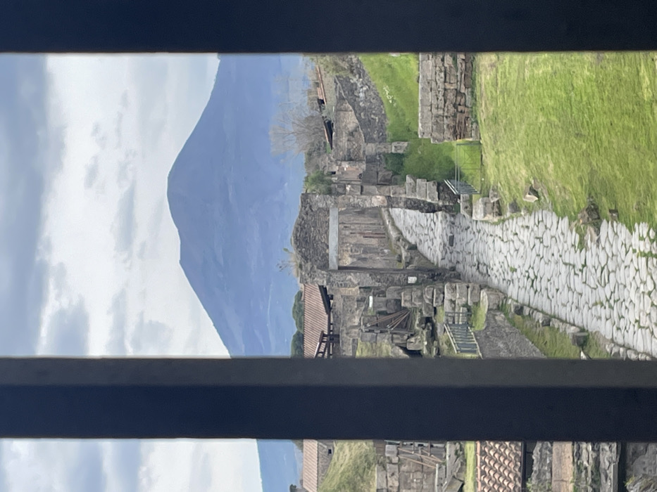 This image depicts an elevated view within the archaeological site of Pompeii, Italy