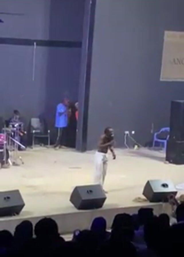 A shirtless man wearing white pants is performing on a stage in front of a crowd. The stage is surrounded by speakers and there is a band set up to the left of the stage. A few people stand near the band. A sign is visible in the background that says "Ancestors." Some audience members are holding up their phones to record the performance. The lighting on stage is bright.