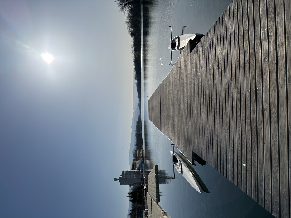 The scene depicts the Plovdiv Rowing Canal in Plovdiv, Bulgaria, under a clear, bright blue sky. A long, dark wooden slatted pier extends centrally from the foreground into the calm, dark blue water, leading towards the distant horizon. Two white single scull rowing boats, each with outriggers, are moored to the pier; one is on the left side, and the other is on the right, both oriented away from the viewer. On the left bank, a multi-story building, possibly a control tower or boathouse, with antennas on its roof, is visible behind a section of flat, wooden floating docks. Spectator stands or bleachers are partially visible near the building. Leafless trees line both the left and far banks of the canal. Distant, hazy mountains form the backdrop on the horizon. A prominent, bright sun with visible lens flare is positioned in the upper right quadrant of the sky, reflecting off the water's surface, creating small glittering patterns. No individuals are clearly discernible within the frame.