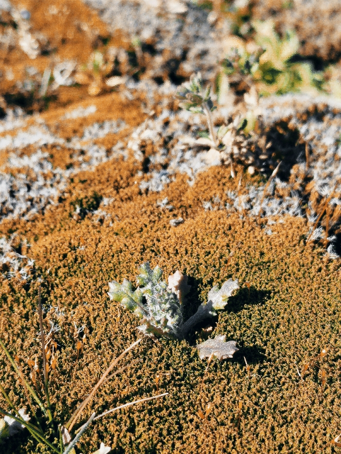 The scene, located in Klenovik, Bulgaria, presents a close-up, low-angle view of ground vegetation. A small, light green plant with lobed, textured leaves is centrally situated, rooted in a dense, finely textured mat of brownish-orange moss or lichen. Thin, dried, pale grass blades are visible in the foreground, particularly to the lower left. The ground surface is predominantly covered by the brownish-orange vegetation, interspersed with irregular patches of lighter, almost white or pale grey fibrous material. The background is out of focus, showing a continuation of these ground textures and sparse green sprouts. Natural illumination casts a subtle shadow from the central plant towards the lower right. No animate subjects or human-made objects are present.