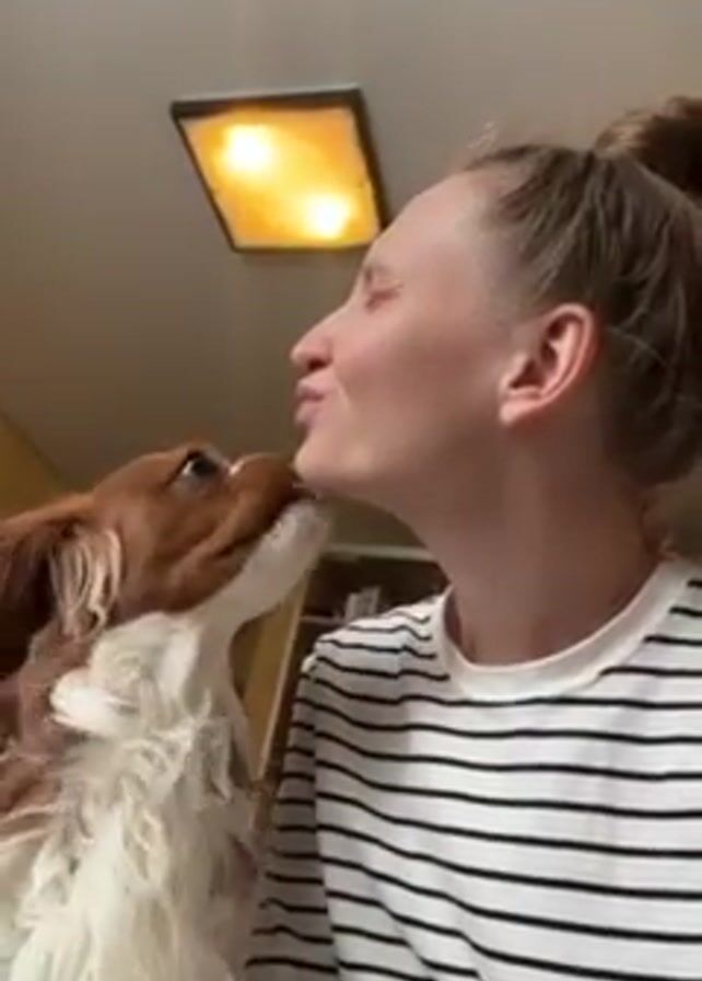 A woman with her hair in a bun and wearing a black-and-white striped shirt is interacting with a brown-and-white Cavalier King Charles Spaniel dog. The woman leans her face towards the dog and makes a kissing face. The dog then licks the woman's face, specifically her nose. The scene takes place indoors, with a ceiling light visible above. A cabinet or shelf can be seen in the background.