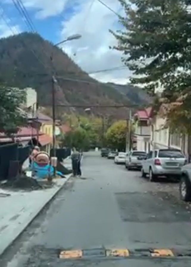 quiet street in a small town. On the left side of the street, two men are standing near some construction materials. On the right side of the street, several cars are parked. In the background, there is a mountain covered in trees. The sky is partly cloudy. The street has several speed bumps.