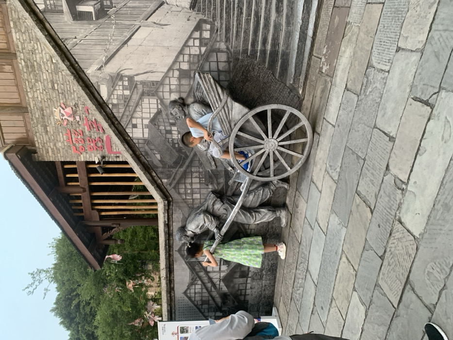 The image depicts an outdoor scene in Ciqikou Ancient Town, Shapingba District, Chongqing, China. A large-scale relief sculpture, rendered in monochromatic grey, is integrated into a multi-level stone wall and staircase structure. The sculpture portrays a male figure pushing a two-wheeled cart, which carries a female figure. The background of the sculpture features etched or carved traditional buildings. Above the sculpture, Chinese characters "磁器口" are displayed in red on a grey brick wall, below a brown wooden building with vertical slats and a traditional roof. Green foliage is visible in the background behind the structure. The foreground consists of a grey stone-paved ground. Three individuals are present: 1. An adult, partially visible on the far left, wears a grey shirt and dark pants. They hold a white mobile phone, appearing to capture an image. 2. A young girl, approximately 5-8 years old, stands to the left of the male sculpture. She wears a green patterned dress and white sneakers, with her hands raised as if interacting with the sculpted figure. 3. A young boy, approximately 7-10 years old, is seated on the sculpted cart. He wears a light blue t-shirt, grey shorts, and blue sneakers, leaning forward and gripping the cart's edge, simulating a ride.