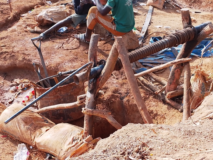 An outdoor scene showcases rudimentary mining operations. A person in a green shirt and another in light-colored pants sit atop a makeshift wooden structure, possibly a winch, while looking at their phones. Beside them, a large, rusty screw mechanism stands above a hole in the reddish-brown earth. Tools, including a shovel and metal pipe, are scattered around a bucket and sandbags, indicating manual digging and material extraction. The environment is earthy and suggests a basic, possibly unregulated, mining site.
