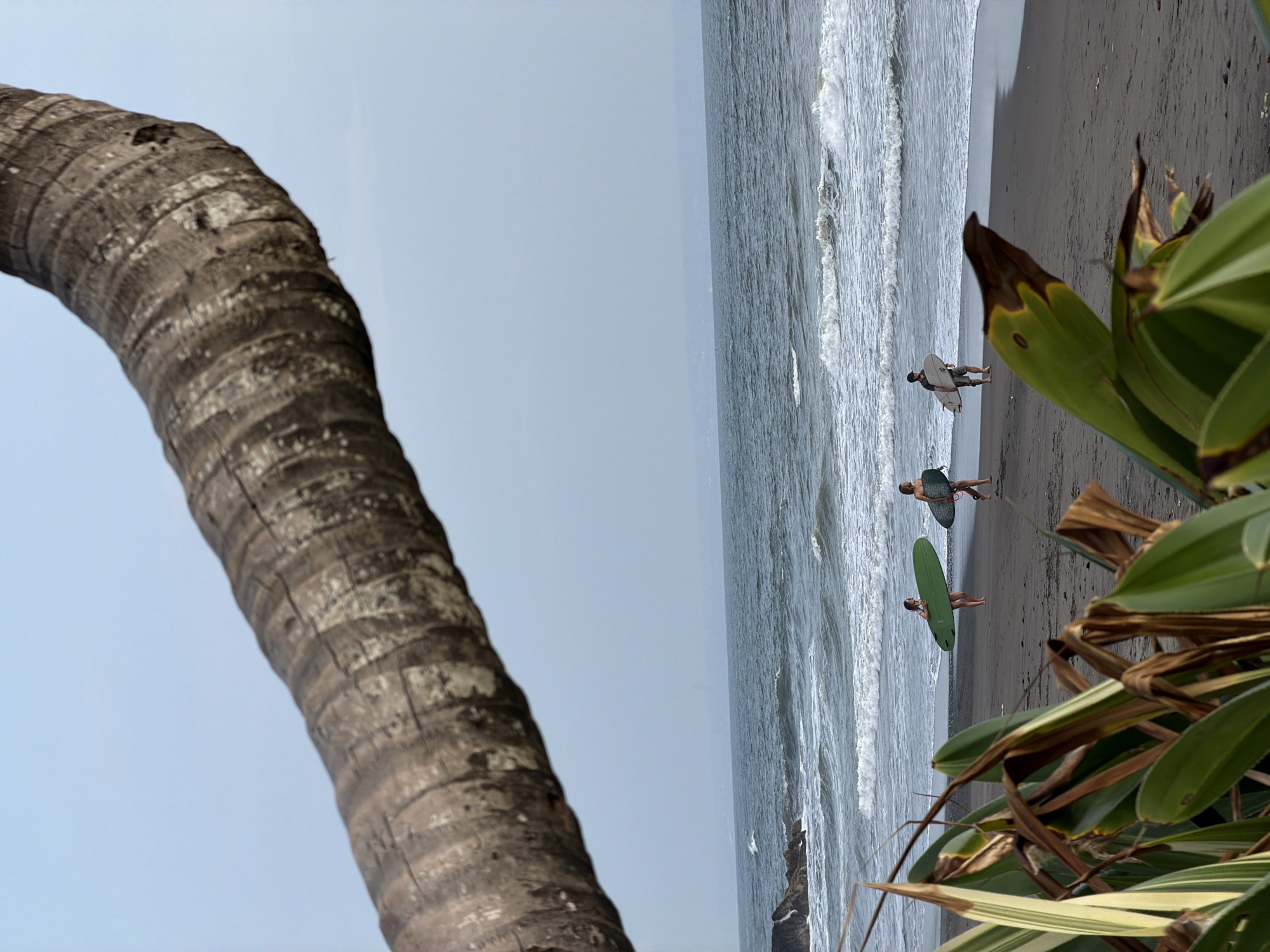 The image depicts a beach scene in Belalang, Indonesia, observed through natural foreground elements. A thick, curved, weathered palm tree trunk extends from the upper left to the upper right, partially obscuring a light blue-grey sky. In the lower foreground, green and yellow-striped tropical foliage with some brown leaves partially frames the view of the beach and ocean. On a dark sandy beach, three individuals are walking from left to right, parallel to the shoreline. The leftmost individual, a female, carries a long green surfboard under her left arm. The middle individual, a female, carries a dark, possibly patterned surfboard under her right arm. The rightmost individual, a male, carries a white surfboard under his left arm. All three individuals appear to be barefoot. The ocean exhibits dark blue-green water with multiple lines of white-capped waves breaking towards the shore. Dark rock formations are visible in the water on the far left. A faint, distant landmass is visible on the horizon.