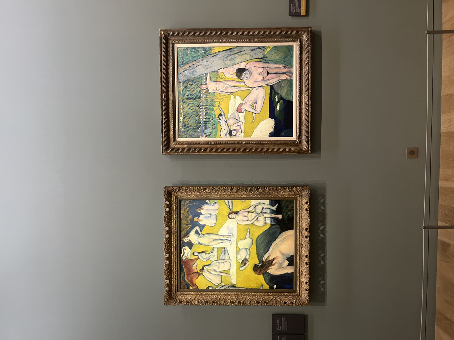 Two paintings hang vertically on a gray wall. Both are framed with ornate gold frames. The top painting depicts a landscape with several nude figures, rendered in blues, greens, and yellows. The lower painting also features nude figures in a landscape, with a predominantly yellow and green color palette. Each painting is accompanied by small informational plaques below. A partial view of a light-colored wood panel with metal accents is visible on the right side of the image.