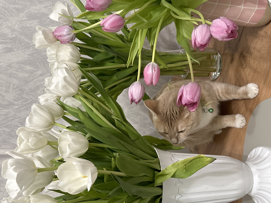The image depicts an indoor scene, reportedly located in Nekrasovskiy, Russia. A light grey, textured wall forms the background. A polished wooden tabletop serves as the primary surface. A tan and white domestic shorthair cat, wearing a light green collar with an attached bell, is positioned on this surface, facing left with its head tilted slightly upward. To the left of the cat, a white fluted pedestal vase holds a dense bouquet of white tulips. Behind and to the right of the cat, a clear glass cylindrical vase contains another large arrangement of white tulips. Further to the right, a pink ceramic vase with a raised grid pattern contains a bouquet of pink and light purple tulips. Multiple individual pink tulip blooms are visible around the cat, with one bloom positioned in close proximity to its head. A partial view of a circular, light grey object is present on the tabletop in the lower-left quadrant.