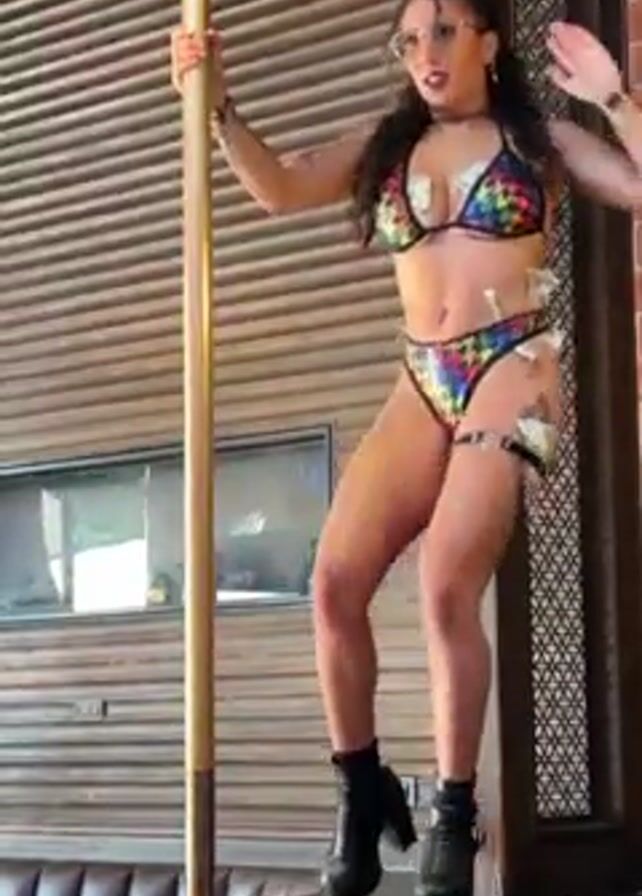 woman pole dancing on what appears to be an outdoor patio. She is wearing a colorful sequined bikini, black heeled boots, and glasses. She has dark hair pulled into a ponytail. Money is tucked into her bikini top and garter. The pole is gold. The background features a wooden-slatted wall and booth seating.