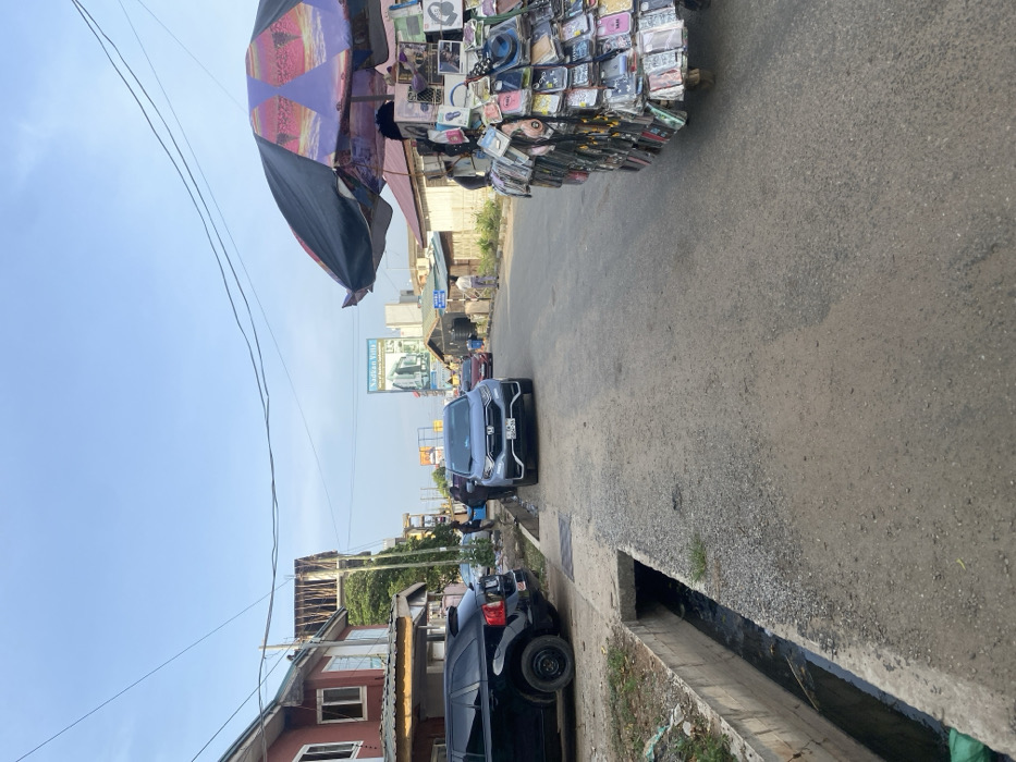 The scene depicts a daytime street in Accra, Ghana, under a clear, pale blue sky. An asphalt road, exhibiting signs of wear, extends from the foreground into the distance. An open concrete drainage ditch runs along the left side of the road. In the immediate foreground on the right, a mobile vendor's pushcart, surmounted by an open umbrella with black, purple, and orange segments, is heavily laden on its visible side with numerous packaged mobile phone cases and accessories. On the left side of the road, a black SUV is parked partially off the asphalt, adjacent to the drainage ditch. Further down the street, a light blue Honda CR-V, displaying a Ghanaian "DV" series license plate, is parked diagonally. Approximately three to four individuals are clustered near the front driver's side of the Honda CR-V. Behind these vehicles, a two-story building with red-brown walls and white window frames features exposed construction framing on its roofline. The right side of the street is lined with various low-rise structures, some appearing to be commercial and constructed with wood or corrugated metal. In the mid-ground, a large billboard displaying the text "Nadkan Yitta" and an architectural rendering is prominently visible. Overhead electrical or communication lines crisscross the sky. Several pedestrians are observed in the background, walking on both sides of the street.