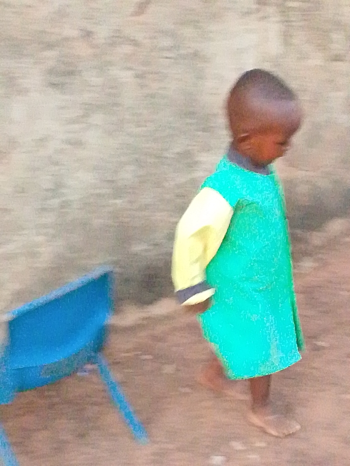 A blurry image captures a young, dark-skinned child walking barefoot. The child wears a vibrant turquoise dress with yellow sleeves, walking towards the right. A blue chair sits to the left of the child. The background is a muted grey, appearing as a wall or a neutral surface. The ground is a dirt surface of light brown. The focus of the image is soft, giving a sense of motion.