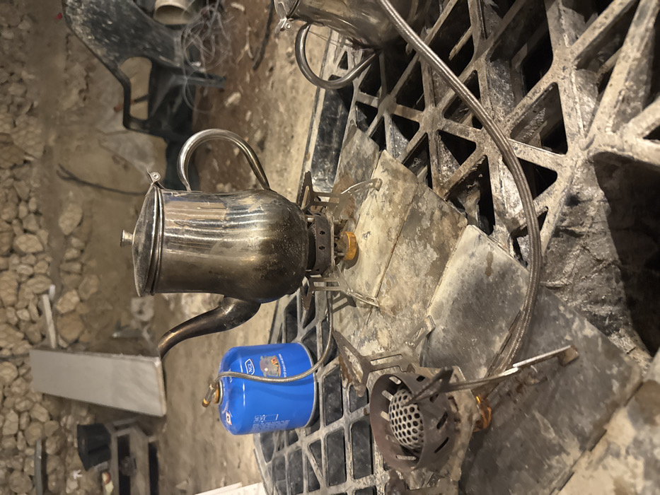 A silver teapot rests atop a portable camping stove, which is connected to a blue gas canister. The stove is placed on a gray, lattice-like surface. The background features a cluttered outdoor setting, possibly a patio or yard, with chairs and stone elements. The overall scene suggests an outdoor setting, likely for tea preparation.
