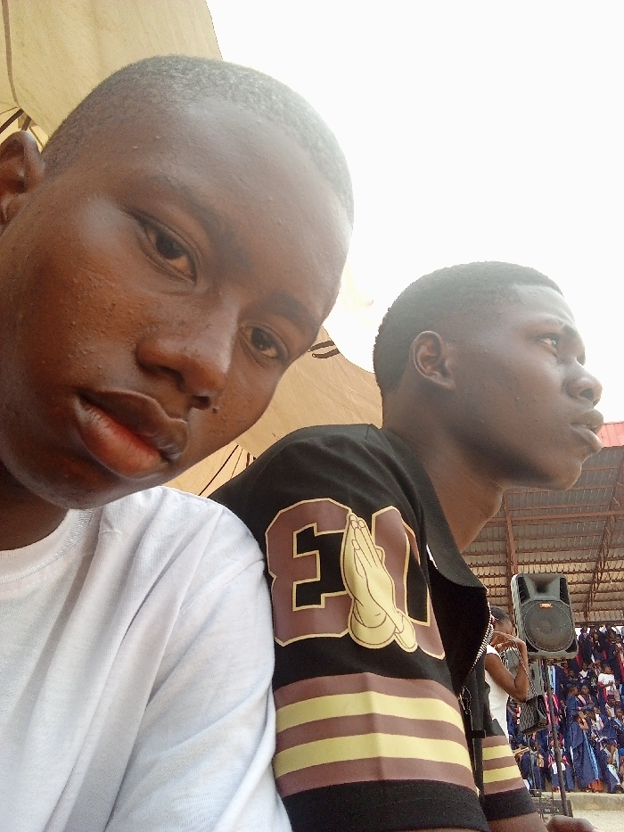 The image displays two young Black males situated in an outdoor event environment. The primary subject, positioned in the foreground on the left, is seen from the chest up, wearing a plain white t-shirt, and looking directly into the camera with a neutral expression. His skin exhibits minor facial blemishes. The second subject, located behind and to the right of the first, is depicted in profile, looking towards the right, and wearing a black collared shirt. This shirt features a gold and brown graphic design on the left chest, including what appears to be an alphanumeric character and an emblem of praying hands. The sleeves have horizontal brown and gold stripes. The background reveals a large gathering of people, many dressed in blue academic gowns or uniforms, seated in multi-tiered bleachers. A large, dark public address system speaker on a stand is visible in the mid-right background, positioned near a partially obscured individual. Overhead, a light-colored tent or canopy structure is partially visible in the upper left portion of the frame. The scene is brightly lit by ambient light, consistent with an outdoor daytime event. The location of this event is Lokoja, Nigeria.