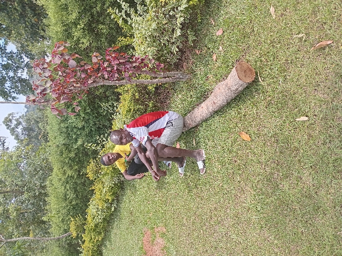 The image depicts an outdoor scene in Manda-Shivanga ward, Kenya, featuring two adult males in a grassy area. In the foreground, a dark-skinned male with a shaved head is seated on a cut log. He wears a red, white, and blue striped short-sleeved shirt, light-colored shorts, and white slide sandals. To his left and slightly behind him, a second dark-skinned male is crouched or seated, wearing a yellow t-shirt and dark trousers. Both individuals appear to be looking forward. The ground is covered with green, manicured grass, with a few dry leaves visible. To the right of the seated male is a small tree with reddish-brown foliage. The background consists of dense green bushes and taller trees under a bright sky, indicating an open, natural, or semi-natural environment.