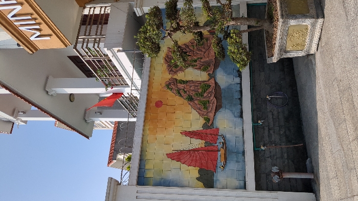 The image displays an exterior scene in Ha Long Ward, Vietnam, under a clear blue sky. In the foreground, a paved ground surface extends. To the left, a grey metal stand or pipe protrudes from the ground. To the right, a dark green, leafy bonsai tree is potted in a large, ornate square planter with golden relief panels. A prominent wall, approximately eye-level, dominates the midground. The upper section of this wall features a mural depicting a seascape with a sunset or sunrise. The mural comprises square tiles or blocks, painted with a gradient sky of yellow and orange fading into blue at the bottom. Applied to this painted background are three-dimensional representations: two traditional red-sailed Vietnamese boats (junks) on the left, and several dark brown, jagged limestone karst formations typical of Ha Long Bay, appearing to rise from the water. A small red circle, representing the sun, is visible in the upper center of the mural. Below the mural, the wall transitions to a dark grey, textured surface with green piping, two spigots, and a coiled hose hanging from a hook. In the background, above the mural wall, a multi-story building with white columns, balconies with metal railings, and red-tiled roofs is visible. A red Vietnamese flag hangs vertically from one of the balconies. To the far right, a section of an adjacent building's facade is visible, featuring the raised white letters "MINH" against a brown background. No individuals are present in the depicted scene.