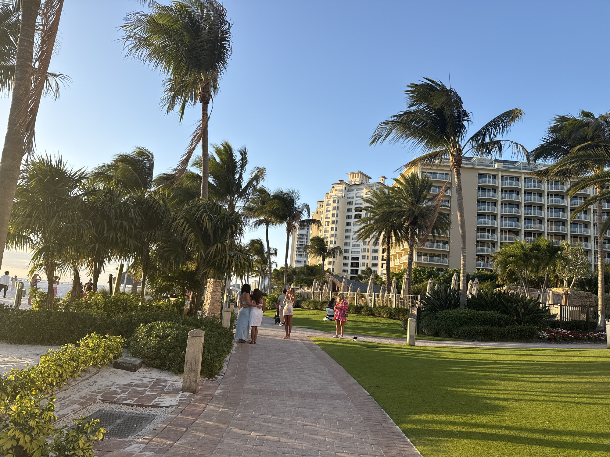 The image captures a scenic view in Marco Island, Florida, United States of America. A brick pathway leads into the scene, flanked by lush green lawns and palm trees. Three young women stand on the pathway, seemingly posing for a photo. The one in the center takes a photo with her phone. The backdrop features a large, multi-story resort or hotel building. Other individuals can be seen in the distance, near the beach. The sky is clear and blue, suggesting a bright, sunny day. Vegetation includes various types of tropical plants and bushes.