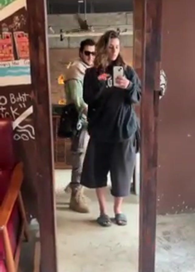 A woman is taking a selfie in a mirror. The woman is wearing a black sweatshirt, gray shorts, and gray sandals. Her hair is curly and brown. Behind her, a man wearing a green shirt, khaki pants, and brown boots is making a peace sign with his hand. He is also wearing sunglasses. The mirror has a wooden frame. There is a red chair to the left of the mirror. The background shows a room with a ceiling fan, various bottles, and a painted wall with the words "Boh Tock". The floor is gray and textured.