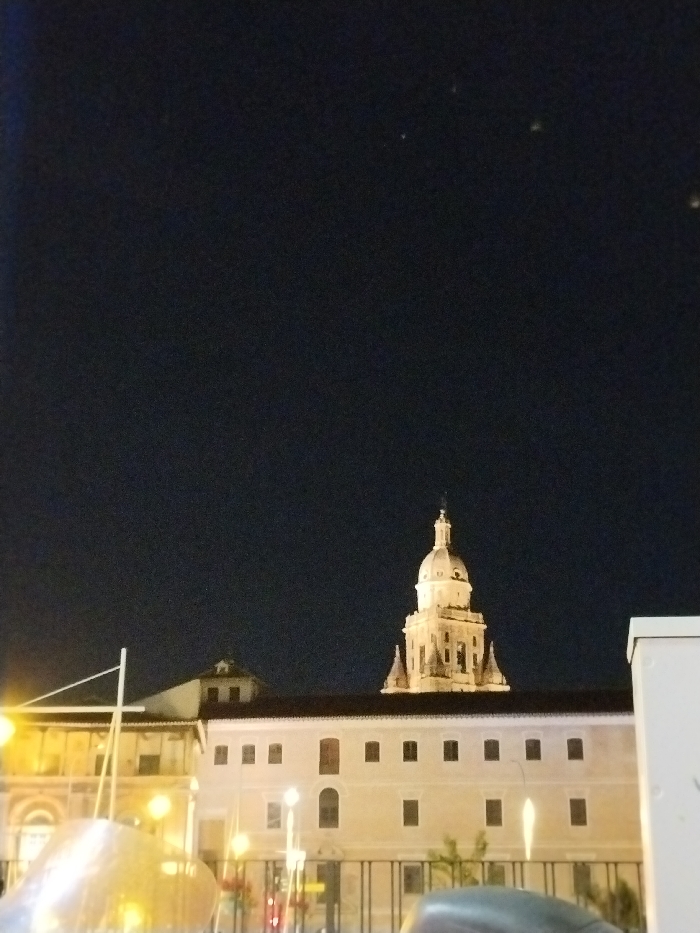At night, a brightly lit domed tower rises above a multi-story building with a symmetrical facade and many windows. Streetlights and indistinct objects illuminate the foreground. The sky is a dark expanse punctuated by a few faint light spots. The building and tower stand out against the night sky.