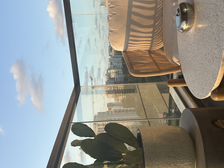 The image depicts an elevated outdoor area, likely a balcony or rooftop terrace, offering a panoramic view of the city of Tel Aviv, Israel, during late afternoon or early evening