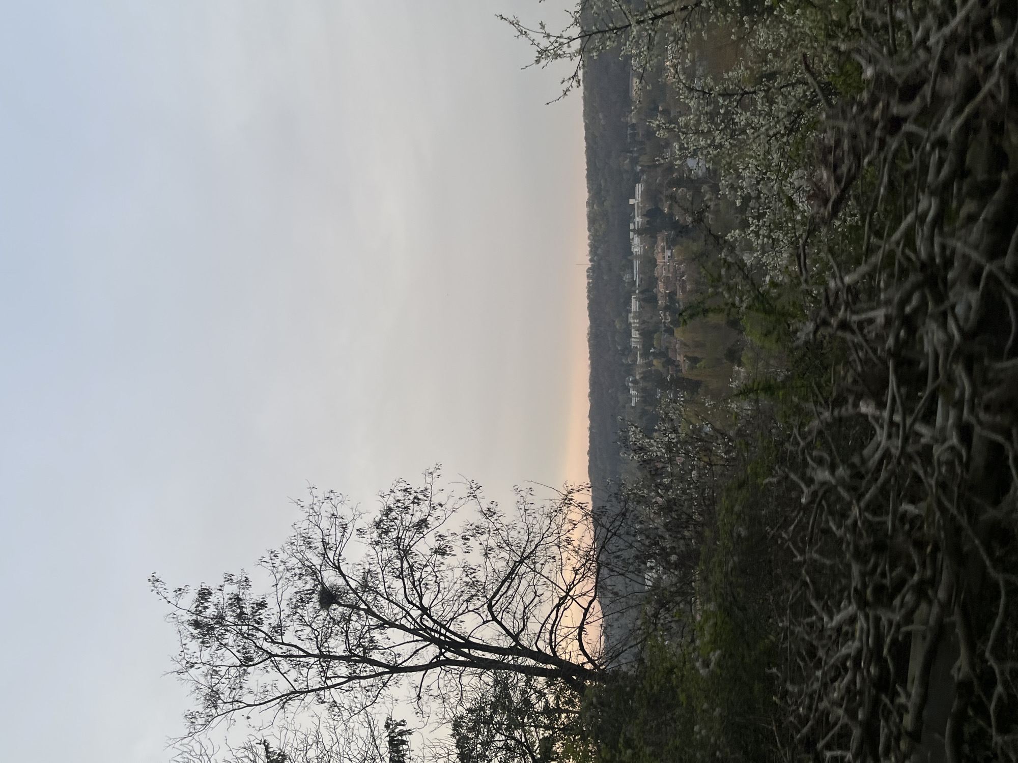 The image displays an elevated panoramic view overlooking a residential valley in Gif-sur-Yvette, France, under an overcast sky exhibiting a faint orange gradient at the horizon, indicative of dawn or dusk in early spring. The immediate foreground features a dense mass of dark, gnarled, leafless woody branches. To the left, a prominent deciduous tree, largely bare of foliage, stands silhouetted against the sky, with a visible bird's nest situated within its upper branches. Further to the right in the midground, a section of a tree or bush displaying white blossoms is present. The background reveals a suburban landscape with numerous buildings, including residential structures with red-tiled roofs and larger white-roofed buildings, interspersed with patches of trees and vegetation within a valley. A densely forested hill forms the distant horizon, with a slender mast or antenna faintly visible atop the treeline. No people or specific interactions are depicted.