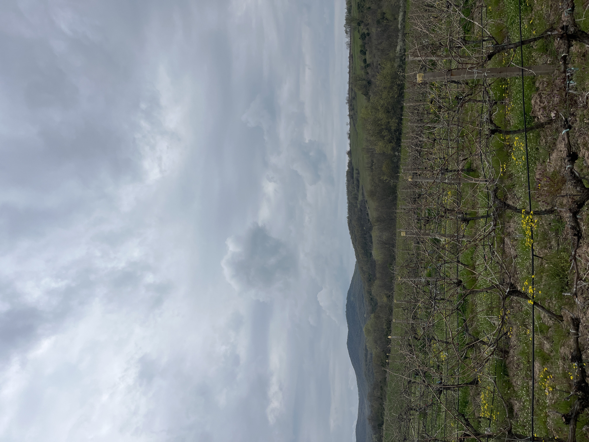 vineyard in an unspecified location, likely near Belitsa, Bulgaria, based on the prompt. The foreground consists of rows of grapevines that are largely bare of leaves, indicating either early spring or late autumn. Ground vegetation, including patches of yellow flowers, is visible between the rows. The sky is overcast with layers of grey clouds. Beyond the vineyard lies a landscape with hills covered in trees, with varying shades of green, suggesting different types or stages of vegetation. No people are visible in the image.