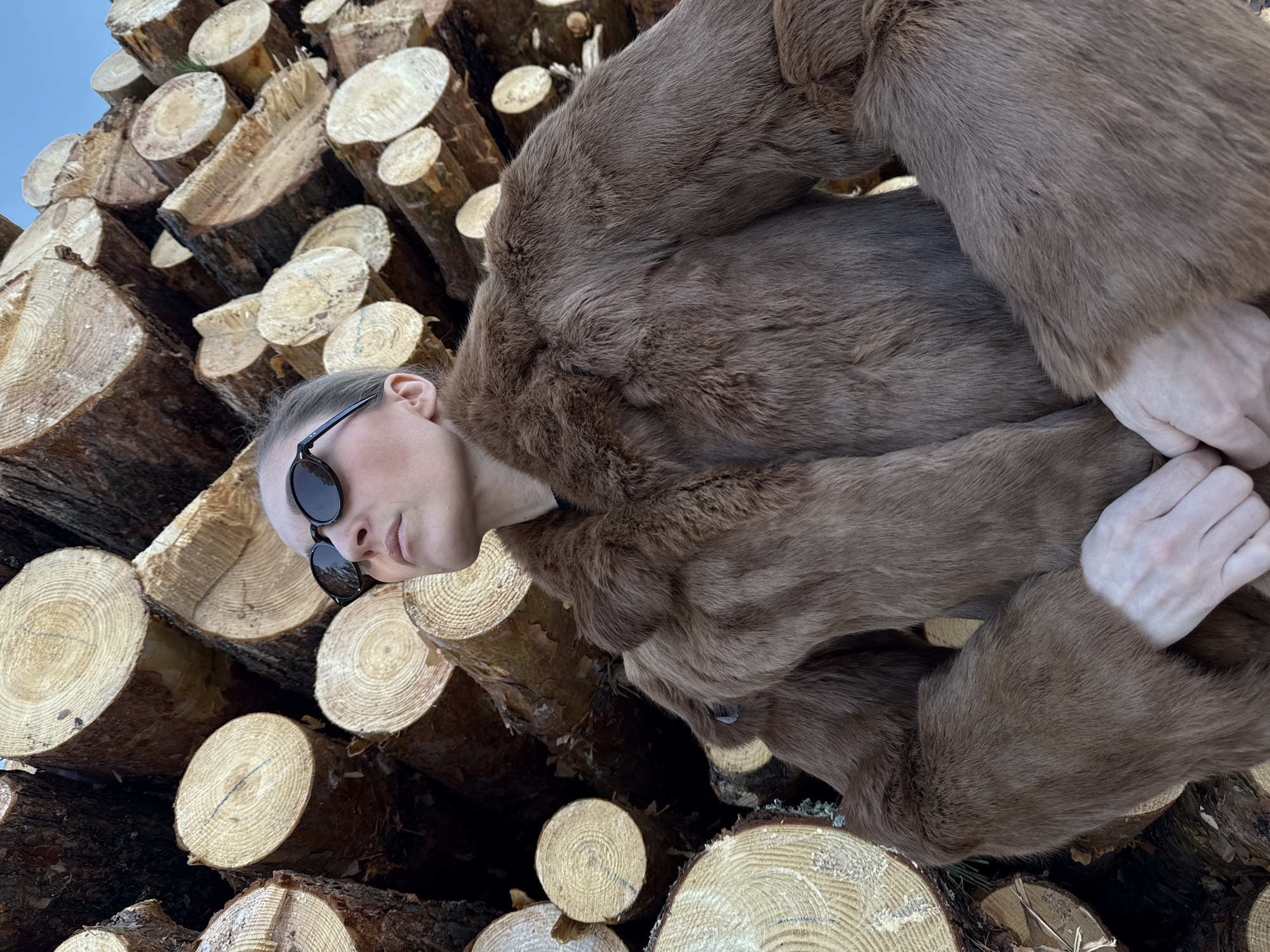 An individual stands outdoors in Noviy, Russia, positioned in front of a large, vertically stacked pile of cut timber logs. The logs, varying in diameter, display light brown cross-sections with visible concentric growth rings and darker bark on their sides; some log faces show dark linear markings. The subject, an adult with feminine features, is partially visible from the chest upwards, angled slightly left and looking upwards. They wear dark, oval-framed sunglasses. Their attire consists of a voluminous brown fur coat with a distinct texture. Both hands are clasped together at waist level, visible just below the coat's sleeves. The upper right portion of the background reveals a clear, light blue sky.