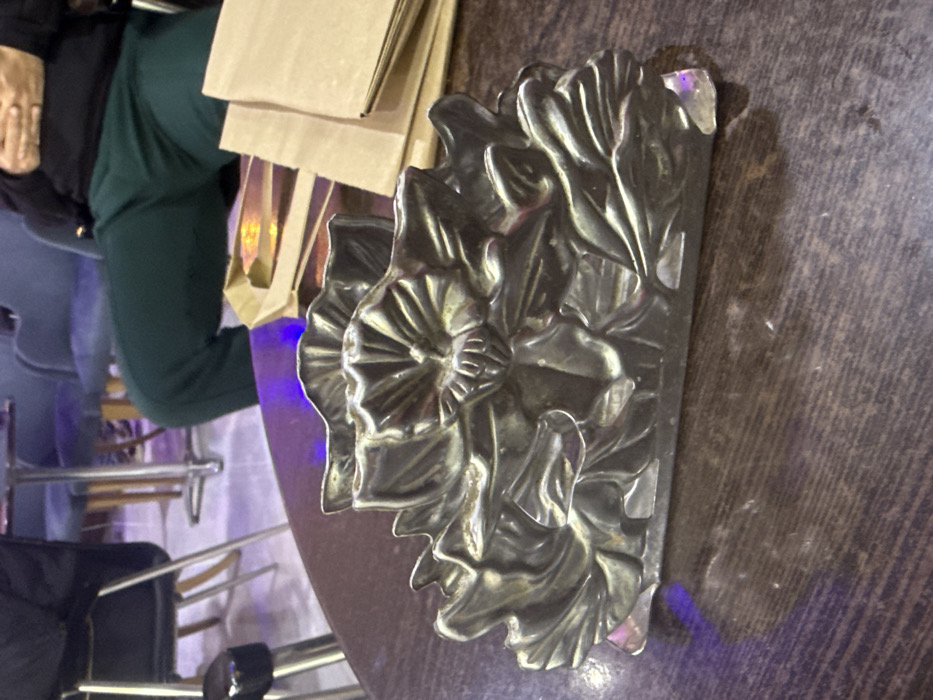 - "A metallic napkin holder, intricately designed with prominent floral and leaf motifs and featuring a dull silver-toned finish, rests centrally on a dark brown wooden table" by FM-kkS2U2, licensed under CC BY 4.0