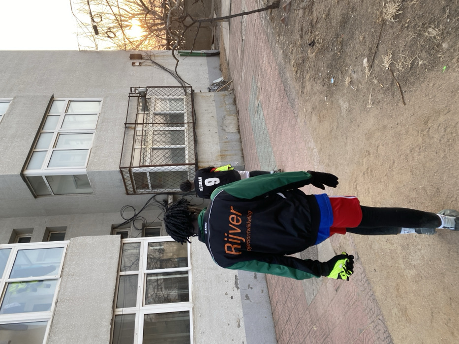 An outdoor scene in Zhongtun, China, depicts two individuals walking away from the camera on a paved path alongside a multi-story, light-grey concrete building under a low sun, indicating either sunrise or sunset. The primary subject, in the foreground, has dark braided hair and wears a black, green, and white jacket with "Rijver projectontwikkeling" printed in orange on the back. This individual also wears black gloves, a blue undershirt, red athletic shorts over black leggings, and athletic shoes. A bright yellow object, possibly a glove, is held in their left hand. Ahead and to the right, a second individual is visible from behind, wearing a black jersey with "ALUMAN" and the number "9" in white on the back. A yellow garment is draped over their right shoulder. The building features multiple windows with white frames; a lower-level window is secured by a dark metal grate. Black utility cables are coiled and run along the building's exterior. A white-framed bicycle is leaning against the building wall near the grated window. To the right of the paved path, which consists of red and grey interlocking pavers, is an unpaved dirt or gravel area with sparse, dry vegetation and scattered debris. A bare, deciduous tree with dark branches is silhouetted against the bright, orange-tinted sky on the far right.