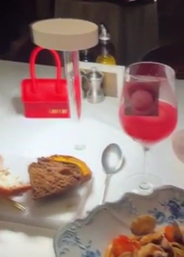 table setting at a restaurant. The table has a white tablecloth. There's a small red purse on the table near a small lamp with a tan lampshade. Plates with food are visible, including bread with butter, pasta with seafood, and a red drink. There's also a spoon on the table. The restaurant appears to be upscale.