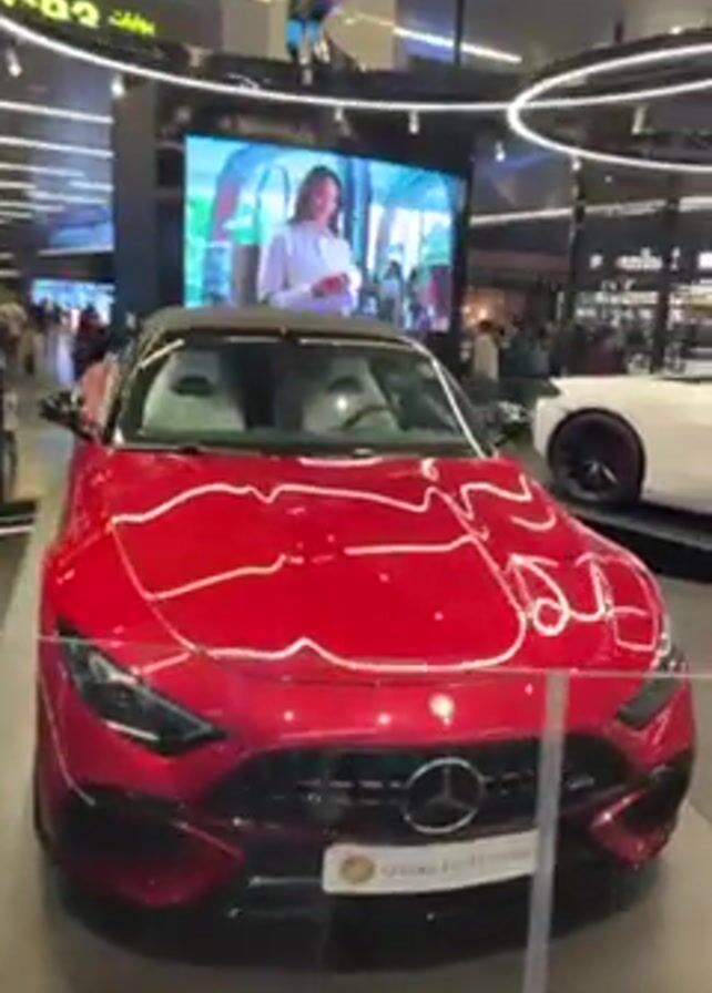 shiny red Mercedes-AMG SL convertible on a rotating platform, likely at a car dealership or mall display