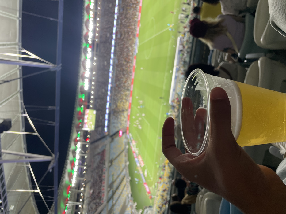 At a nighttime stadium, a hand grips a clear plastic cup filled with yellow beer. The view looks down on a soccer field filled with players and spectators. Bright lights line the stadium, with visible structural supports on the left. Seats are visible around the hand and cup, with other spectators sitting nearby.
