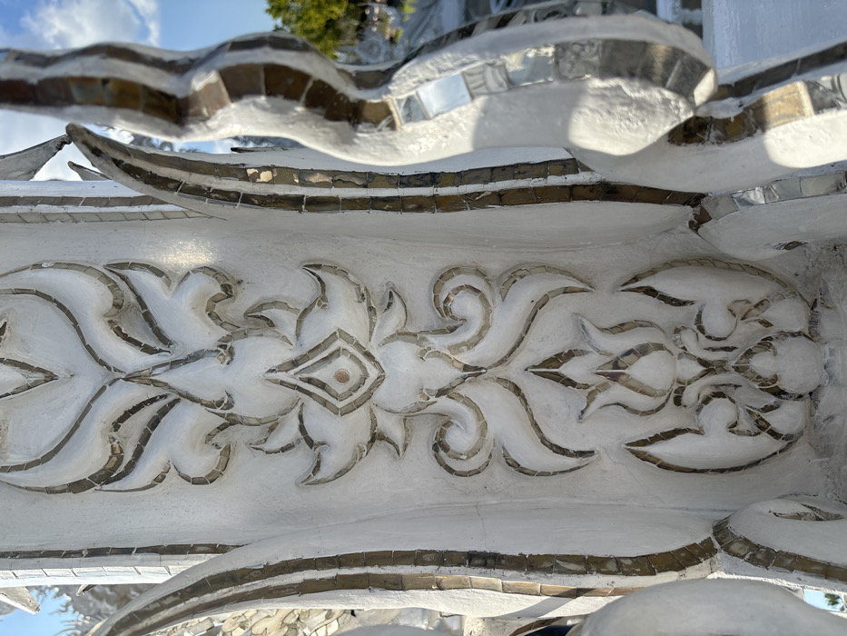 A detailed, vertical image displays an architectural element of the Wat Rong Khun (White Temple) located in Ban Rong Khun, Thailand