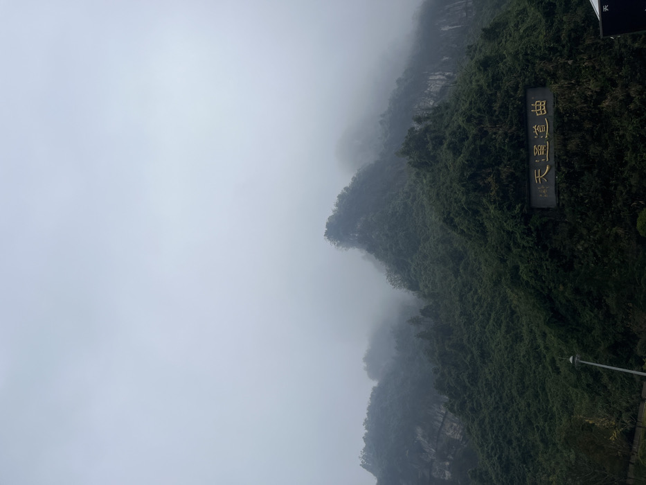 A foggy, green mountainside with trees is partially obscured by dense mist on the left. A dark sign with gold lettering, partially cut off, is visible on the right side of the image. The atmosphere is overcast and obscures distant features. A portion of a street light pole is visible at the bottom of the frame.