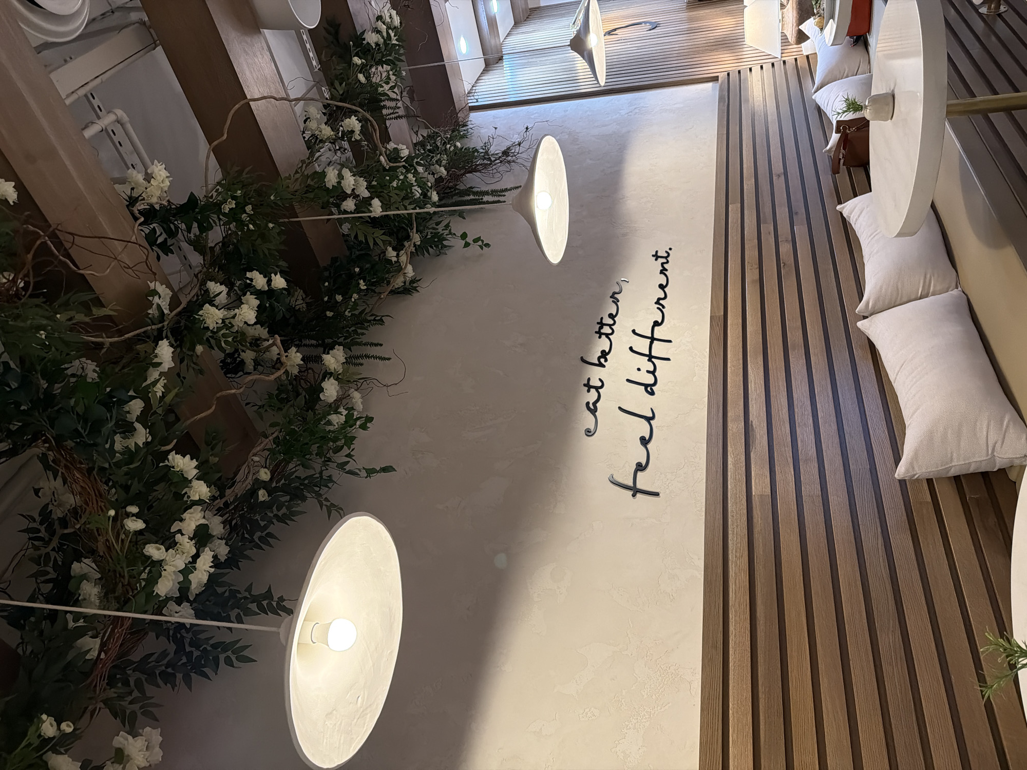 This image depicts the interior dining area of a Pressed Juicery establishment in Las Vegas, United States. No individuals are present. The scene features a modern, naturalistic decor. The ceiling is characterized by exposed wooden beams running horizontally, from which extensive artificial greenery with numerous white flowers and interwoven bare branches hangs, creating an overhead canopy. Several white, dish-shaped pendant lights, each containing an illuminated bulb, hang from the ceiling, casting bright light downwards. The main wall visible is divided horizontally. The upper section displays a light beige, textured stucco finish. Centered on this section, the phrase "eat better, feel different." is affixed in black, three-dimensional cursive lettering. The lower section of the wall is clad in horizontally-oriented, medium-brown slatted wood paneling. Running along the base of this wall is a continuous banquette with light tan upholstered cushions and multiple white throw pillows. In the foreground, a round white table with a marble pattern top and a golden pedestal base is visible. A small white vase containing a sprig of green foliage sits on this table. Further to the right, a brown leather handbag rests on the banquette, and another table with a white tablecloth and a dish containing unidentifiable food is partially visible. The far right section of the room also features vertical wooden slat paneling and a table lamp with a white shade.