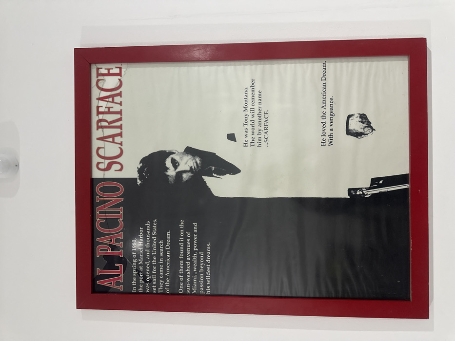 A framed poster of the film "Scarface," prominently featuring Al Pacino's name and the title